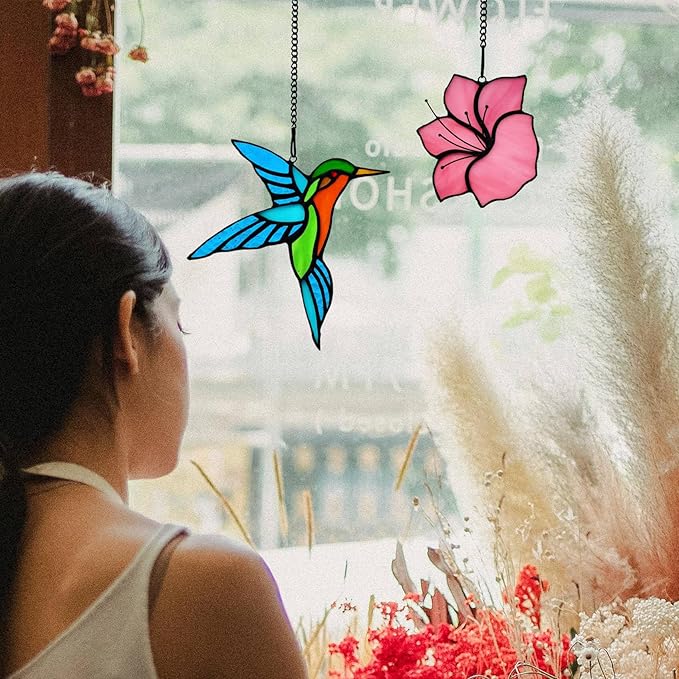 • Handcrafted, REAL Stained Glass: Each hummingbird with flower suncatcher is expertly crafted using vibrant stained glass pieces that are skillfully arranged to create a beautiful and colorful bird design.Also each package includes 2 pieces of different hummingbird with flower suncatcher.