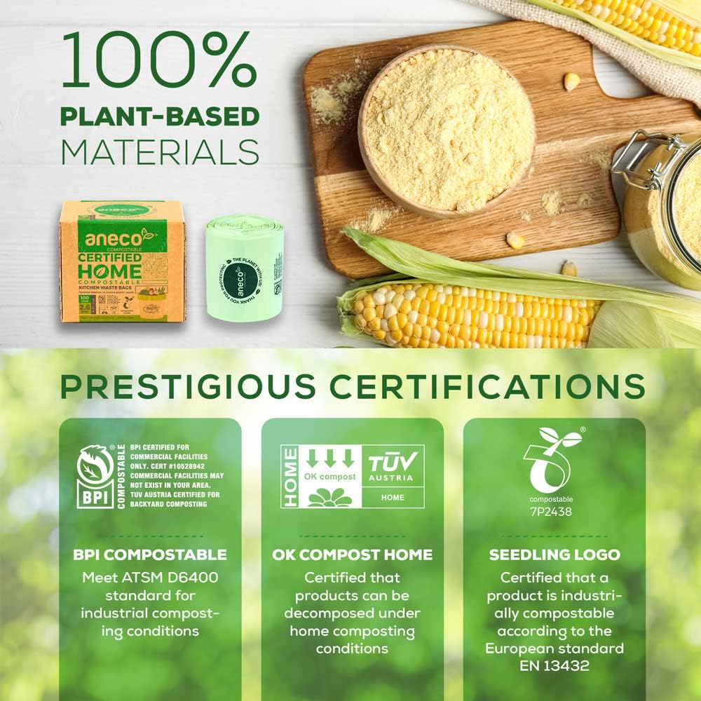 • 🍀 Proud to be one of few HOME compostable trash bags in the market, ANECO Compostable bag can decompose completely not only in industrial facilities but also in home system. Use these bags to collect kitchen scraps and put them straight into the compost dumpster, or bury and turn them into valuable compost for your garden