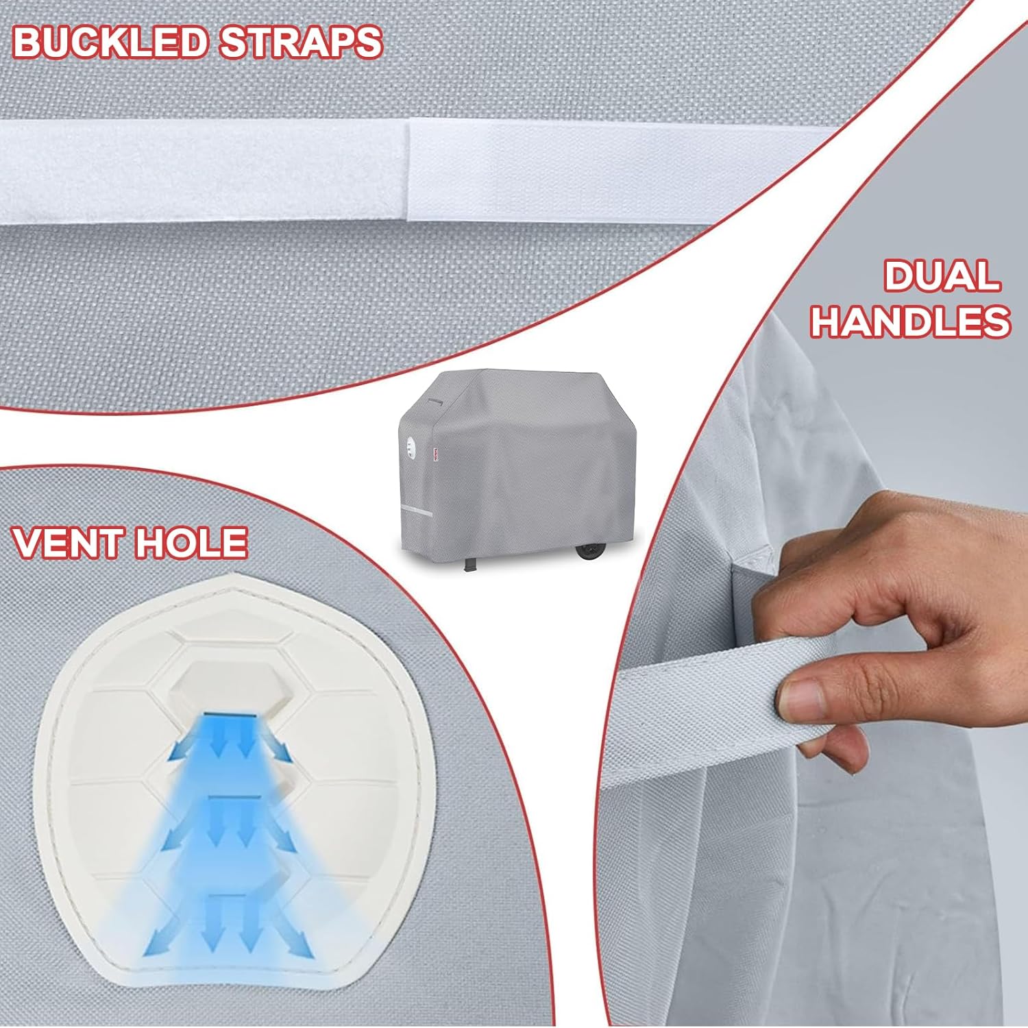 • 【Feature】- Durable handles and straps on both sides for fixing the cover. Handles provide convenience for fitting and removal. Straps help tighten and prevent the cover from being blown off. The air vent hole would ensure that your gas grill wouldn't become dirty and keep dry.