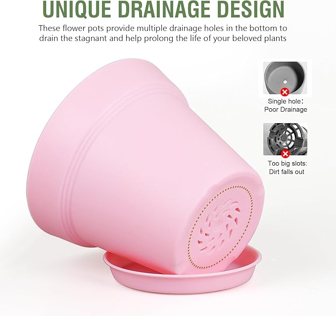 • 【Drainage Holes and Trays】Each plant pot features well-designed drainage holes at the bottom to ensure proper water flow. Additionally, saucers catch excess water, keeping your growing area clean and tidy while also ensuring that your plants remain hydrated without becoming waterlogged.