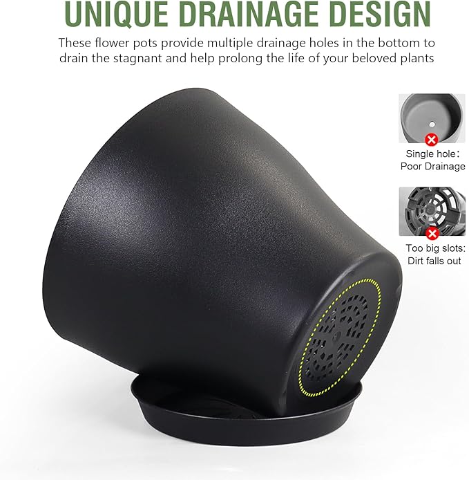 • 【Drainage Holes and Trays】Each plant pot features well-designed drainage holes at the bottom to ensure proper water flow. Additionally, saucers catch excess water, keeping your growing area clean and tidy while also ensuring that your plants remain hydrated without becoming waterlogged.