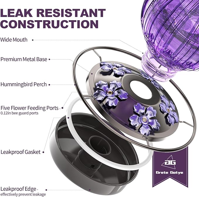 • LEAKPROOF FUNCTION - Build-in durable gasket, unique design makes base connection proper and seamless, even when the hummingbird feeders for outdoors hanging is shaken by wind or birds perching on it. After filling the container and screwing it onto the base, flip it over and hang it on a tree/deck hook/shepherd's hook/hangers/window hook.