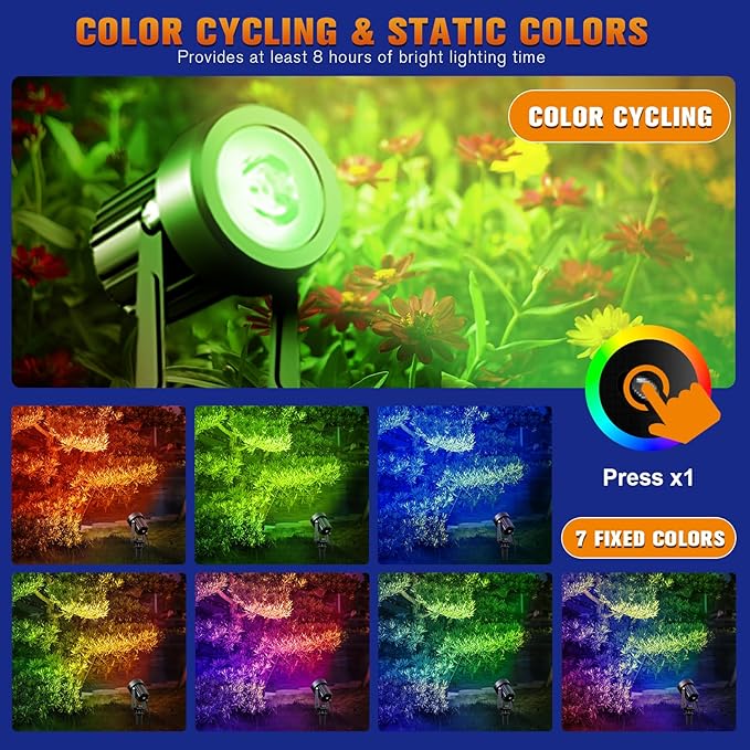• 【RGB Solar Spotlights】Long press to turn on solar color changing lights outdoor with removable solar panel, switch between the two modes:colorful lights are great for Christmas and Halloween,but also for everyday decoration of your palm trees, gardens, walls and more