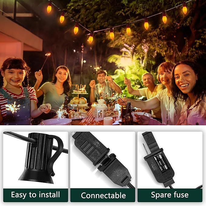 • Safety-Assured Halloween Lighting:Ensure reliable and safe Halloween illumination with C9 LED orange bulb lights. With a 6" lead featuring a male plug, 12" spacing between bulbs, and a 6" tail with a female connector, they come equipped with built-in UL-listed fuse protection. If one bulb goes out, the others will remain lit, and an extra fuse is provided for your peace of mind.