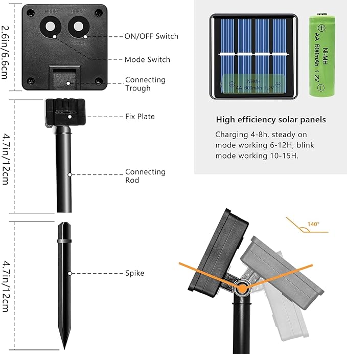 • 【Solar Powered & Auto On/Off】: This outdoor string lights charging by solar energy, no extra electric cost, and no need to replace the battery. It can work up to 10~15 hours at night after fully charged under sunshine for 4~8 hours. Light sensor controls the multicolor solar lights charging at daytime and auto on at dark.