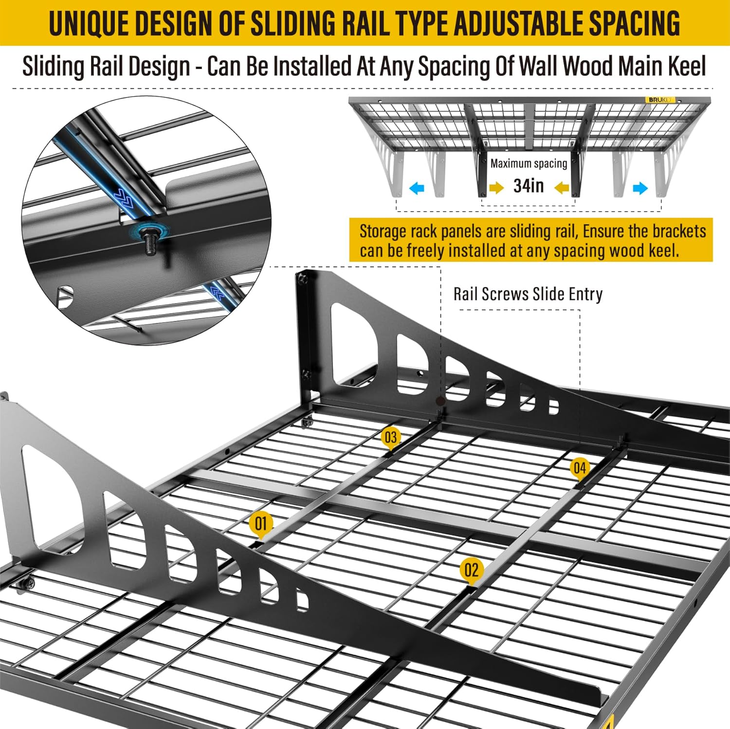 • SUPERIOR DESIGN: Wall shelf garage storage rack is made of heavy-duty frame structure and thicker wire mesh combined with welding, the panel and bracket connection is adjustable slide rail design, Both ends of the bracket can be installed freely in the 8"-45" range of wood wall keel spacing. Eliminating the worry of not being able to connect due to the mismatch of the spacing of the load-bearing wooden wall keel.