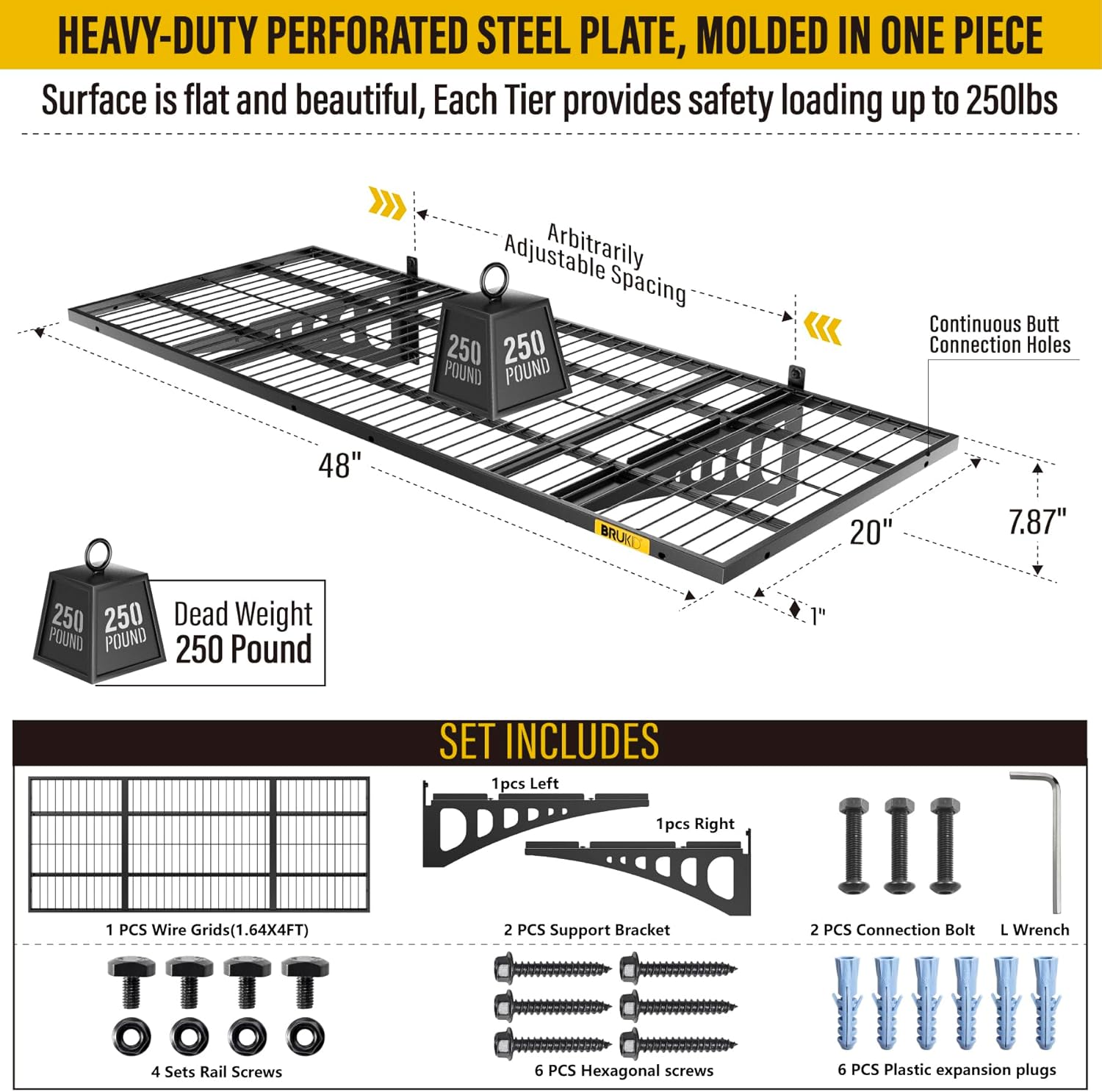 • KIT INCLUDES:Includes 1pc-Grid Shelf; 2pc-Brackets; 6pc-Hexagonal screws (Hardened ∅0.2" L/2"); 4Sets-Rail attachment bolts; 1pc- Drill bit; 1pc-Socket; 1pc-installation manual. All hardware of Brukid Professional Series Wall Mounted Shelf are under strict quality control and testing, We strive to provide our customers with a quality shopping experience, If you have any questions, Please feel free to contact us.