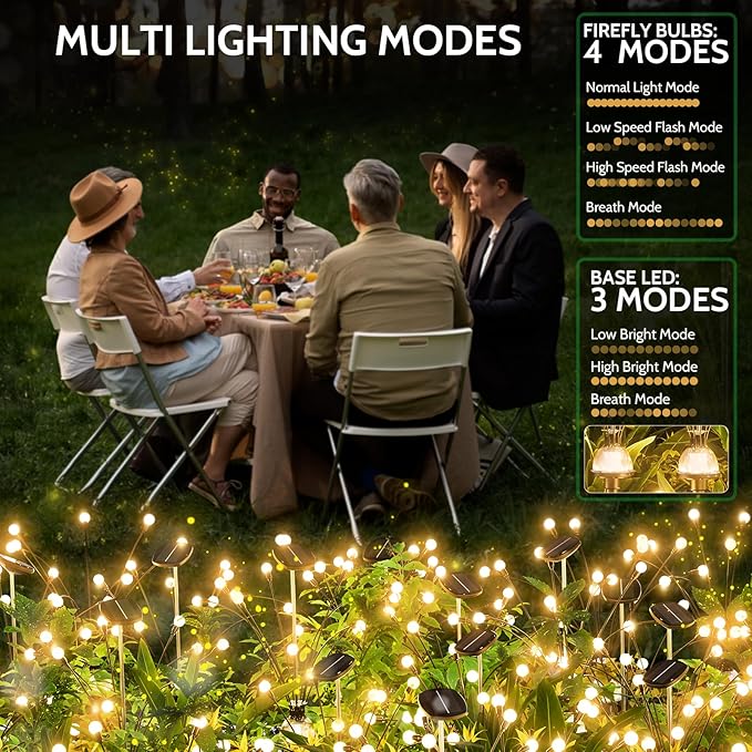 • 【Superior Performance and Unique Design】Our solar firefly lights have 9 larger and brighter premium LED firefly bulbs. In addition to the 9 firefly bulbs, there is an illuminating LED light at the bottom which is composed of 6 LED bulbs with warm white lighting to illuminate the pathway. The solar firefly lights can light up for 10-12 hours during all night after a 6-8 hours solar charged in day even if it is a cloudy or rainy day.