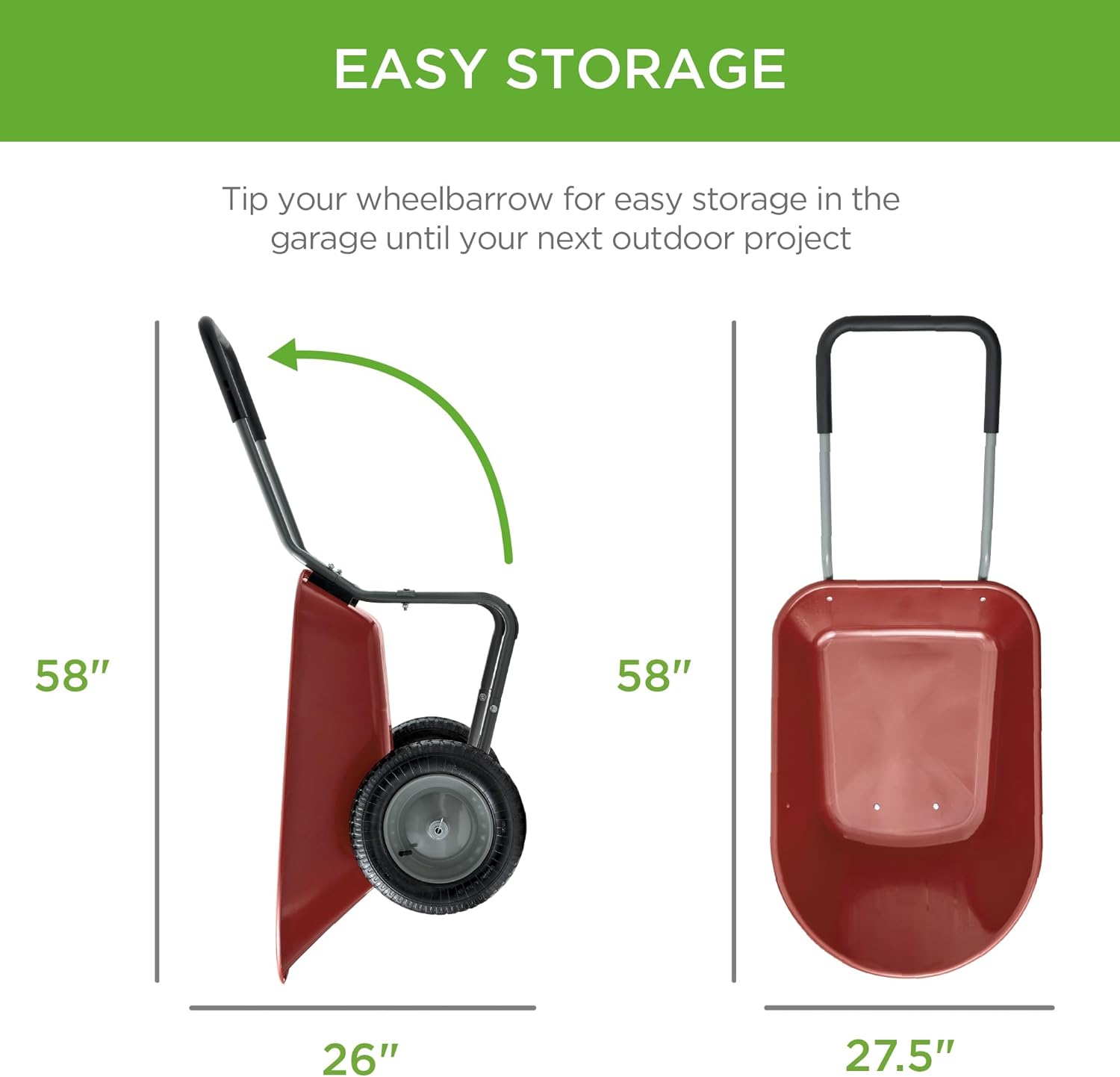 • EASY STORAGE: A compact profile combined with easy tipping action allows you to seamlessly store this wheelbarrow upright in your garage or garden shed; OVERALL DIMENSIONS: 58"(L) x 27.5"(W) x 26"(H); Weight Capacity: 330 lbs.