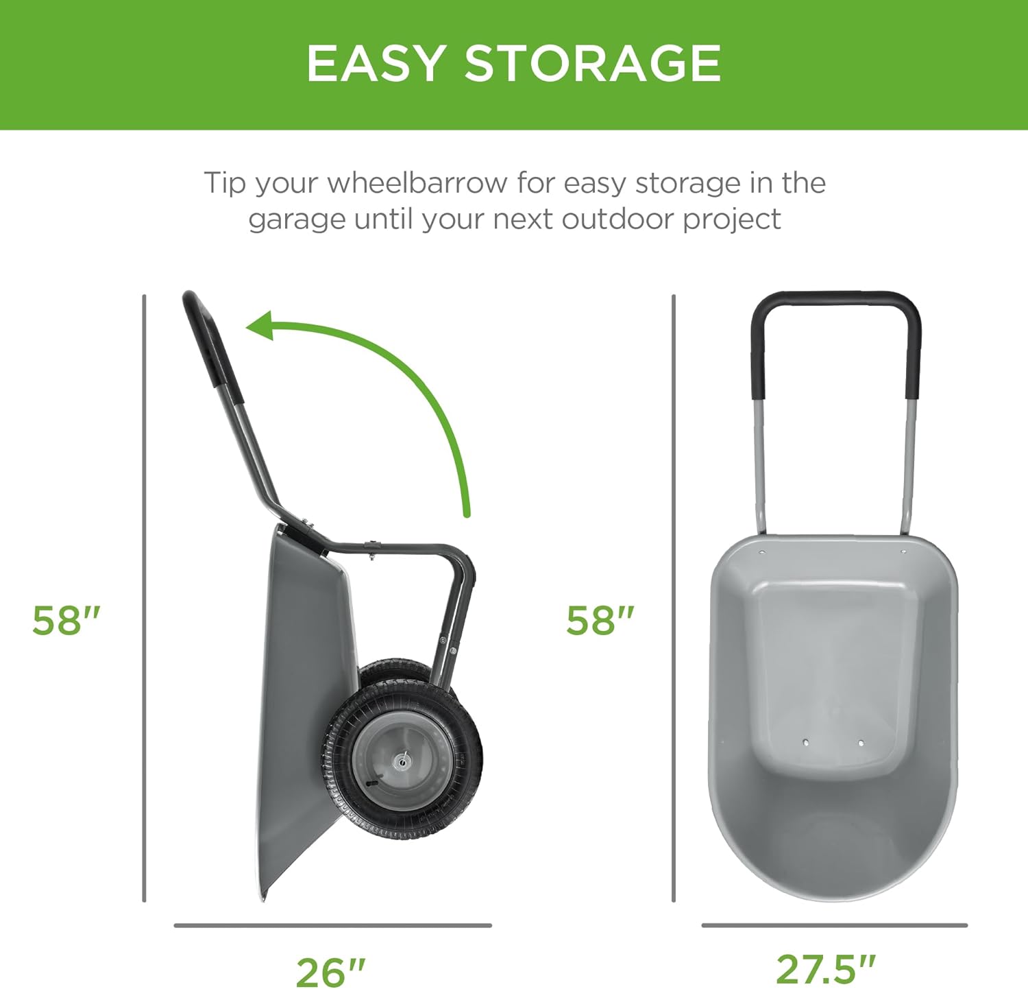 • EASY STORAGE: A compact profile combined with easy tipping action allows you to seamlessly store this wheelbarrow upright in your garage or garden shed; OVERALL DIMENSIONS: 58"(L) x 27.5"(W) x 26"(H); Weight Capacity: 330 lbs.