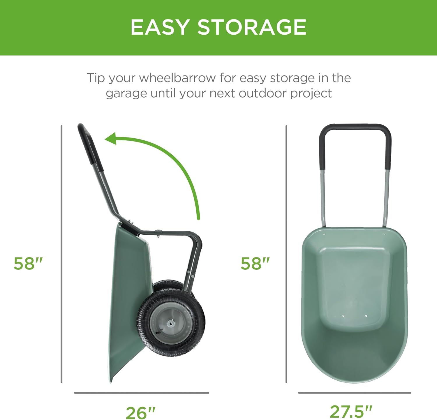 • EASY STORAGE: A compact profile combined with easy tipping action allows you to seamlessly store this wheelbarrow upright in your garage or garden shed; OVERALL DIMENSIONS: 58"(L) x 27.5"(W) x 26"(H); Weight Capacity: 330 lbs.