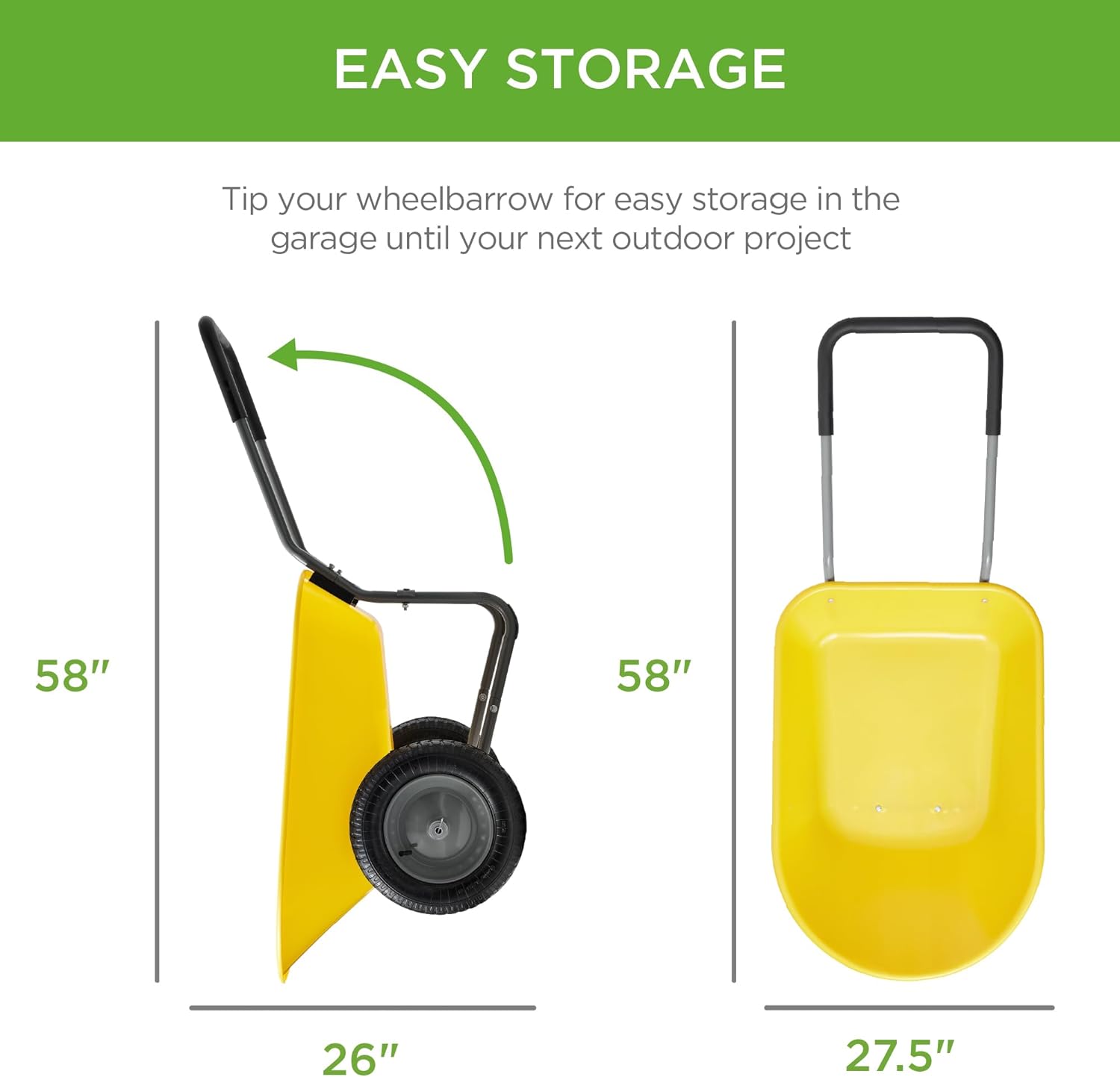 • EASY STORAGE: A compact profile combined with easy tipping action allows you to seamlessly store this wheelbarrow upright in your garage or garden shed; OVERALL DIMENSIONS: 58"(L) x 27.5"(W) x 26"(H); Weight Capacity: 330 lbs.