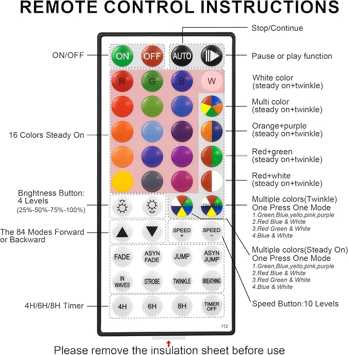 • Remote Control : Use the included 32-button wireless remote control to easily select different colors, choose from 8 lighting modes for each color, adjust speed and brightness, and set a timer (4/6/8 hours). Our user-friendly remote control is designed to be clear, intuitive and eye-catching. To use the remote control, remove the insulating tab in the remote control and align it with the controller box.