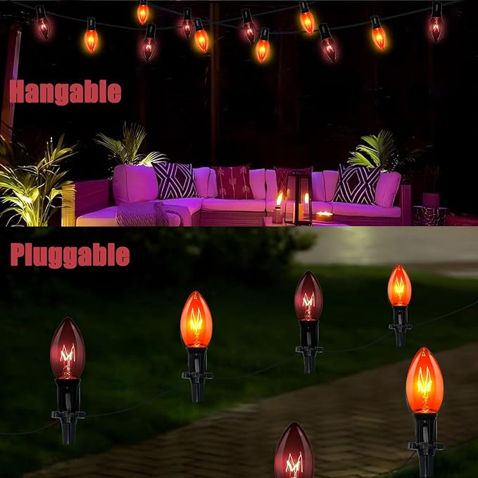 • End-to-End Connection:19.5 Ft Halloween decorations pathway lights with 10 C9 orange and dark purple light bulbs, E17 base, 7W, 6" lead cord with male plug, 24" distance between C9 incandescent lights, 12" lead cord with female connector, total 19.5 feet halloween lawn lights can connect up 6 strands, plug in halloween walkway lights can be used for outdoor parties, holiday decorations, or simply adding a touch of whimsy to your garden.