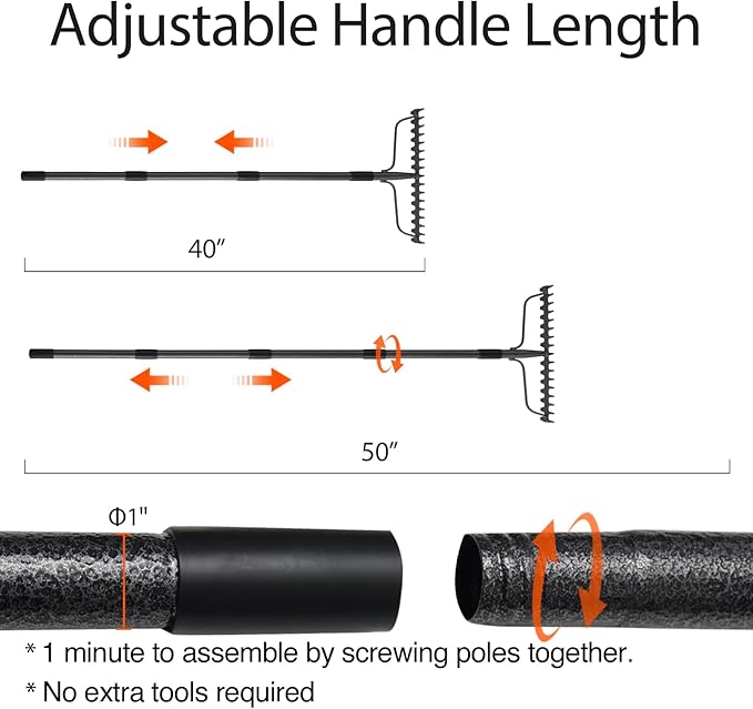 • 1 minute to assemble hand rake by just screwing poles together with all screws provided.