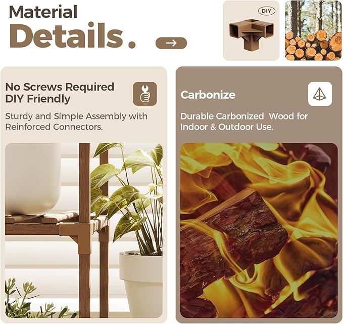 • Premium & Sturdy Wood: Our Wooden Plant Stand is crafted from premium wood, carbonized at 572°F for unmatched water and heat resistance. This process not only extends its lifespan but also ensures it remains a healthy choice, eliminating the need for extra paint or varnish
