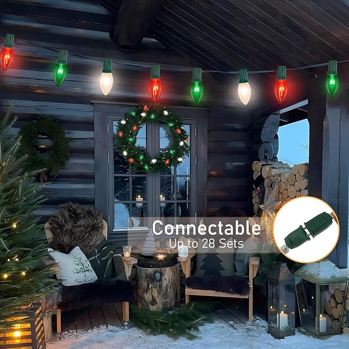 • Flexible & Expandable: Create stunning light displays with red, green and white christmas lights that offer seamless end-to-end connectivity. The secure E17/C9 candelabra socket base allows you to link up to three strands together easily, perfect for covering large areas and making your festive decorations truly stand out.