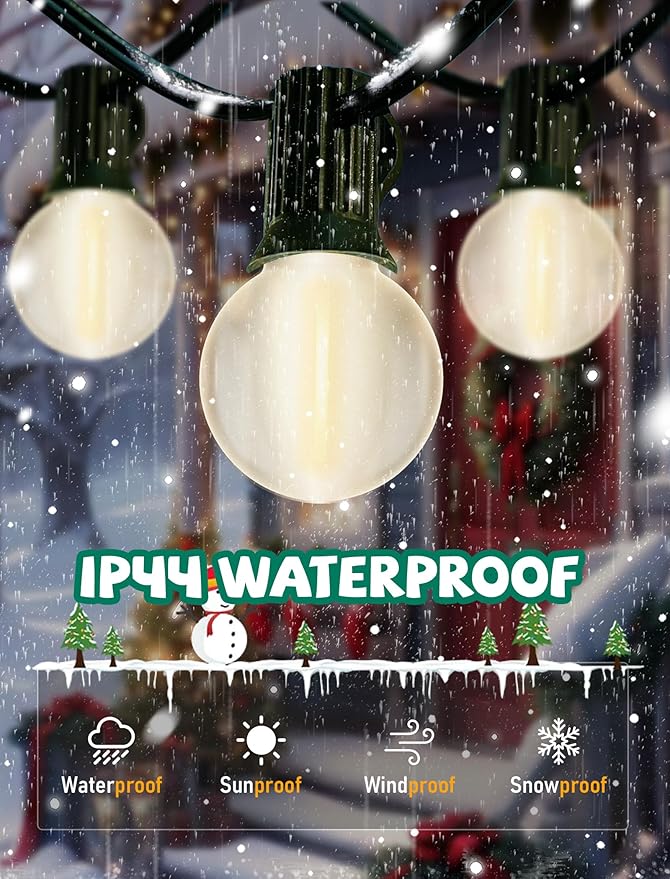 • Versatile G40 Christmas Lights: Illuminate your space with the G40 LED frosted white outdoor string lights, compatible with any E12 socket. This 25ft set includes 25 frosted LED bulbs and 2 spares, creating a soft, inviting glow for both indoor and outdoor settings, all mounted on a stylish green string.