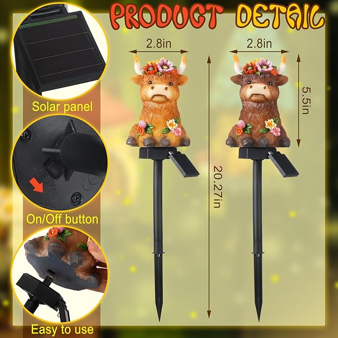 • Cute Highland Cow Gnome Lights: you will receive 2 highland cow solar stake lights, with its exquisite appearance and cute color matching, it will emit a bright glow when night falls, which looks interesting and vivid