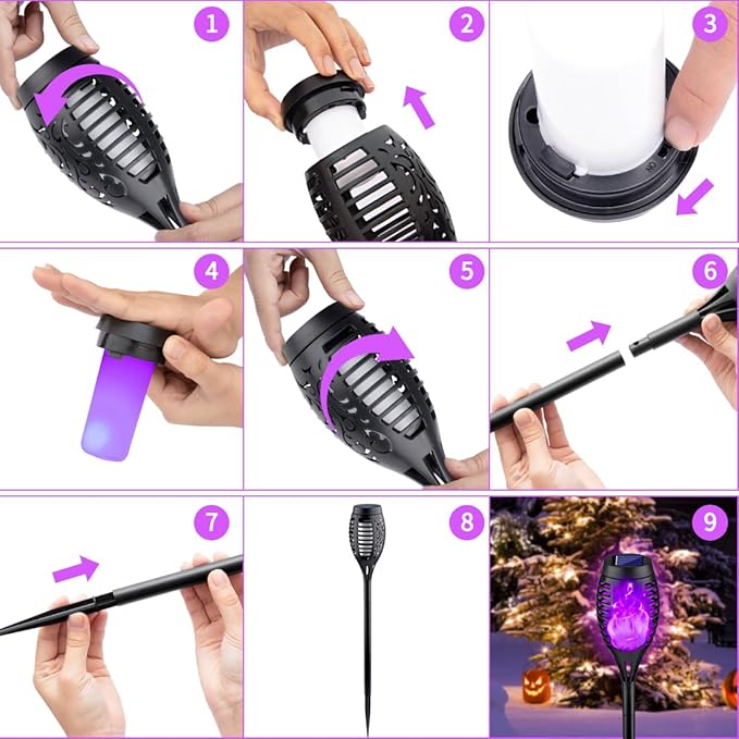 • Halloween Decorations Use Tips: These are 8Pack purple solar halloween lights in package. Any lack of spike or solar torch lights, please contact us via amazon. Please read instruction manual carefully before using halloween yard lights.