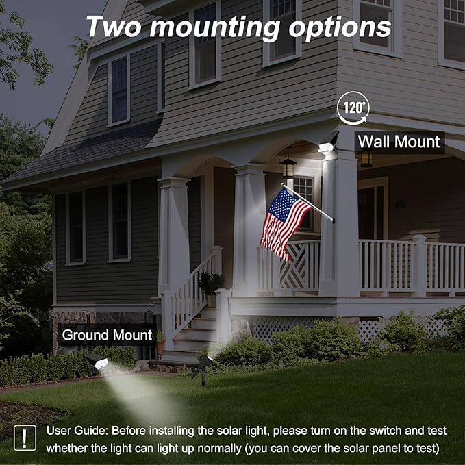 • 【Eco-friendly & easy installation】This solar spotlight stores solar energy for lighting and is versatile, no cables to lay and takes less than 30 seconds to install! Then feel free to illuminate landscapes, pathways, trees, bushes, flags, house facades and more!