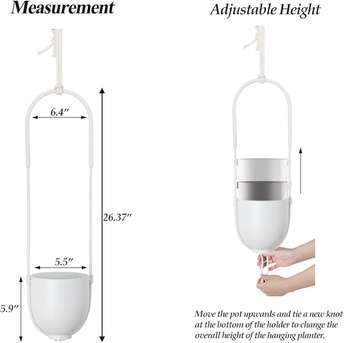 • Material: The hanging plant pot is made of iron and solid cotton rope, the pot and handle are sprayed at high temperature with matte white pigment, which is durable and rust-resistant. Light weight (No drainage hole)