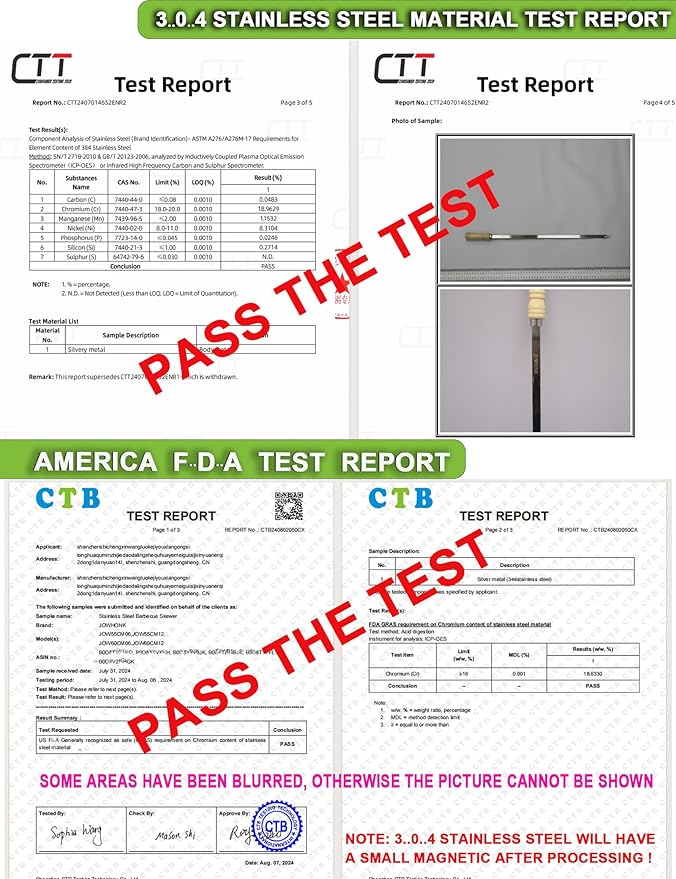 - 【304 STAINLESS STEEL HAVE WEAK MAGNETISM】304 stainless steel may have weak magnetism because during the processing and forging process of the product, a small amount of austenite is converted into martensite, so 304 stainless steel may have a little magnetism,which is a normal phenomenon.We have America F..D..A test report and 304 stainless steel material test report, you can buy and use securely.