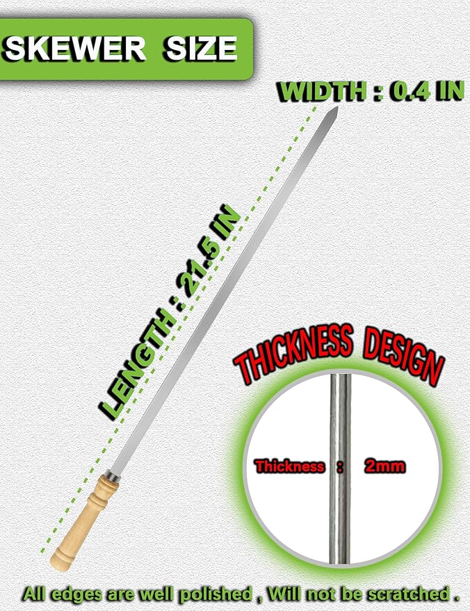 - 【FOOD GRADE 304 STAINLESS STEEL】JOWHONK BBQ 304 stainless steel skewers for grilling are 21.5 inches long,0.4 in width,0.07 in thickness. Our wooden handle flat metal skewers for kabobs are made of premium 304 stainless steel, Ensuring non-rust long time durability, Heat resistant and non-poisonous,Harder than other stainless steel and iron.It's safety for children.Our Premium Stainless steel Barbecue skewers are reusable. The BBQ kabob skewers surface is smooth that grilled food residue won't get stuck onto the kabob skewer blade.
