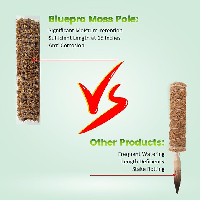 • [Unique Design] Bluepro launched a new slimmer version—15" moss pole to help our customers better grow their small size plants. This moss pole for climbing plants is semi-cylindrical in shape, compared to coco coir poles that are generally cylindrical on the market, and its exclusive flat surface will let your plant's aerial roots to better attach to it.