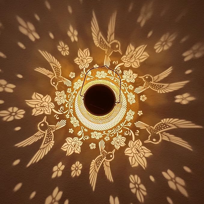 • Graceful Decorative Design - The retro appearance, with gold copper color and hollow out metal veneer, the solar outdoor lanterns casts bright and warm light in darkness, accompanied by gorgeous and graceful hummingbirds patterns, adding a beautiful atmosphere to the surrounding environment.