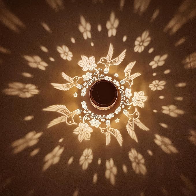 • Graceful Decorative Design - The retro appearance, with gold copper color and hollow out metal veneer, the solar outdoor lanterns casts bright and warm light in darkness, accompanied by gorgeous and graceful hummingbirds patterns, adding a beautiful atmosphere to the surrounding environment.