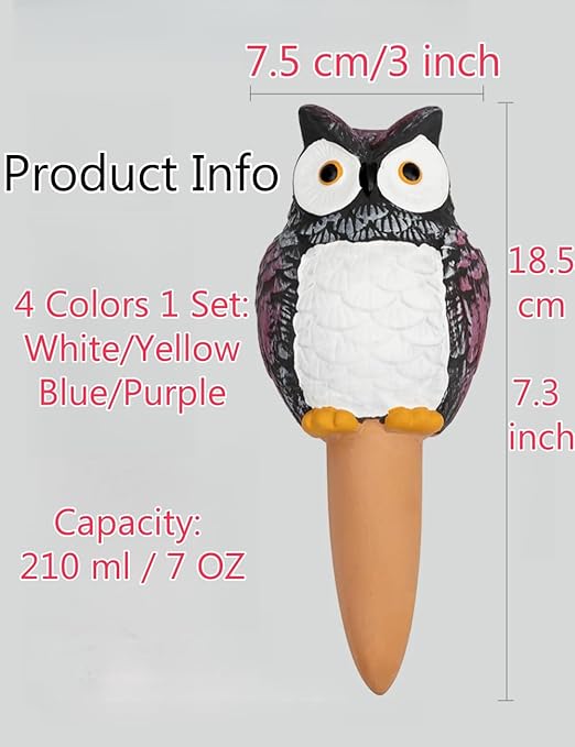 • 🦉Easy to Use: Simply soak the terracotta in water, insert self-watering spikes into the soil, and fill it up. The wide opening makes refilling easy, and the automatic plant waterer gradually releases water into the soil, keeping your plants perfectly moist without overwatering.