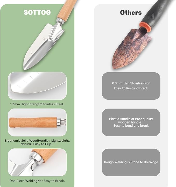 • Heavy-duty gardening tool kit:Is made of high-strength stainless steel, which is sturdy and durable and has extremely strong rust and corrosion resistance. Besides, during use, the tools hardly deform or break and can efficiently deal with any challenges in gardening work.
