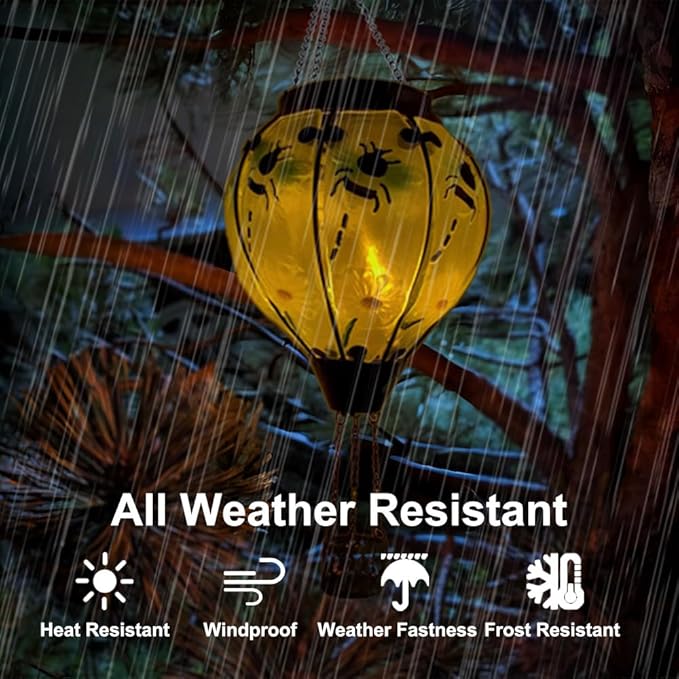 • Weather Resistance: The IP44 waterproof hanging solar lantern can adapt to various weather conditions it can can be used indoors or outdoors; Outdoor solar lantern is 5.5" W *18" H; Its metal parts have a protective coating and are not easy to rust