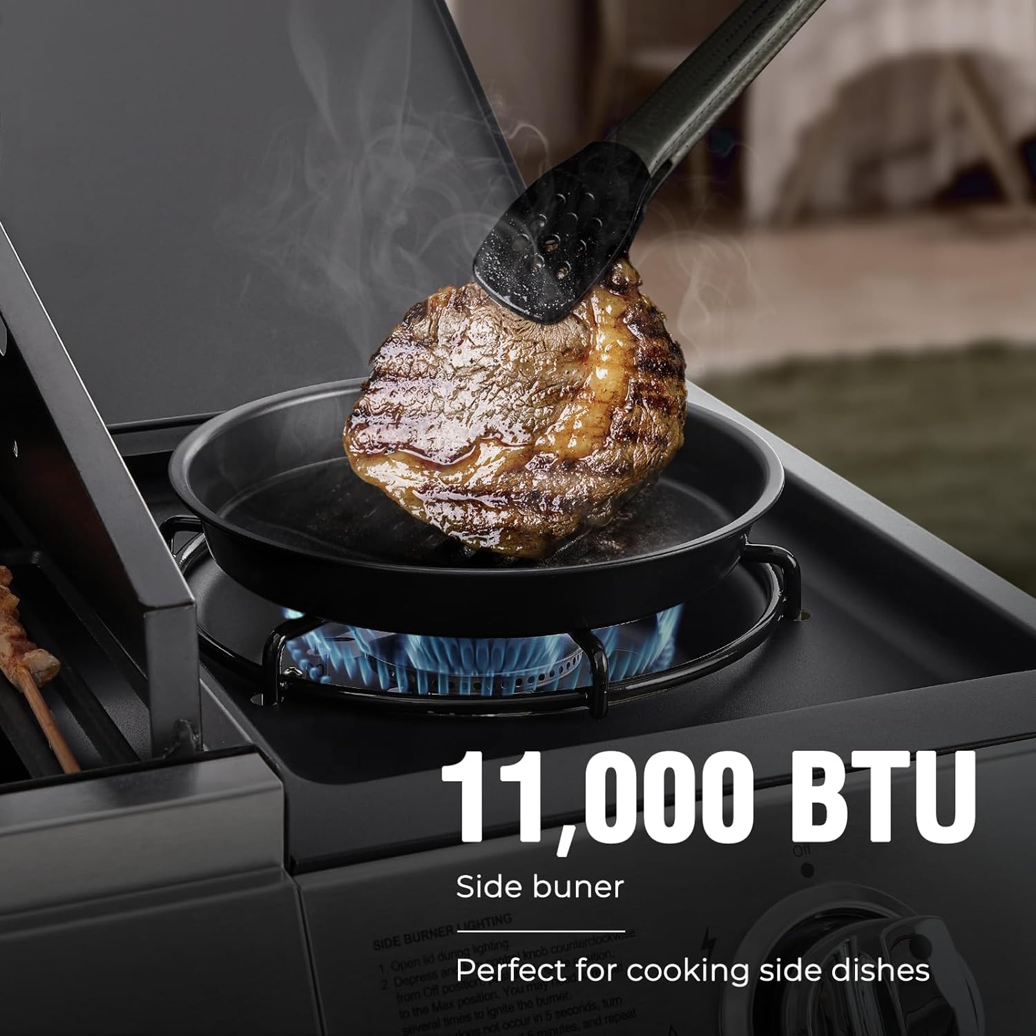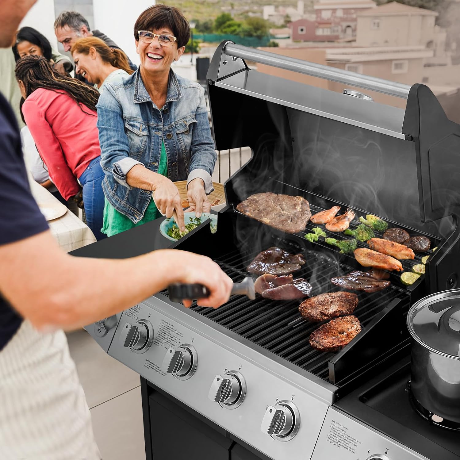 • 【Enhanced Heat Control with More Burners】This outdoor gas grill features 4 main burners and 1 side burner, delivering a total of 49,000 BTU; Perfect for searing steaks and cooking with pots and pans, it offers precise temperature management