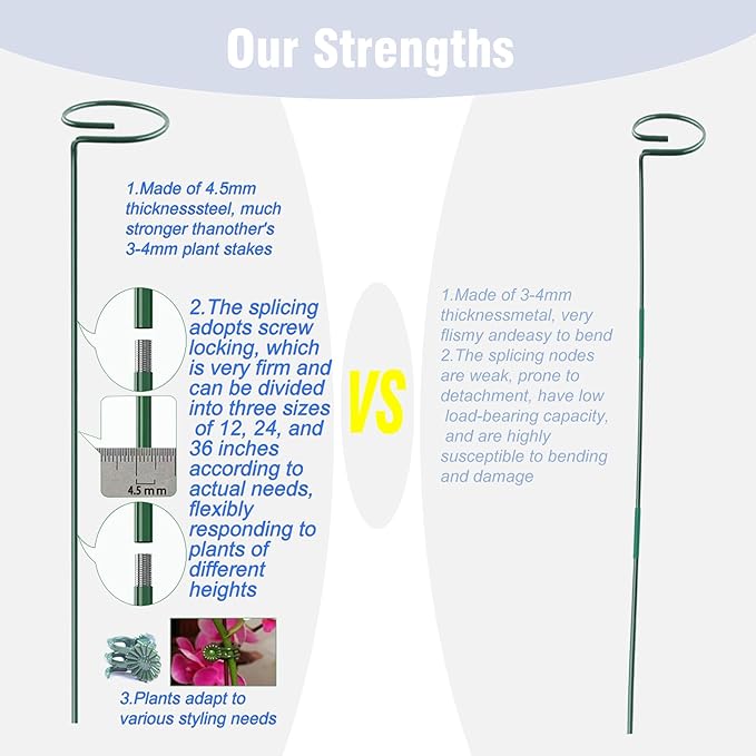 • Upgraded Thickened Plant Support Pole: plant support pole thickened, diameter 4.5 mm, threaded rotary powerful combination, sturdy and durable; carbon steel material, plant support pole surface is treated with anti-rust treatment, rustproof/won't break/split/burn off, provides strong reusable. Smooth and flat surface, won't prick your fingers.