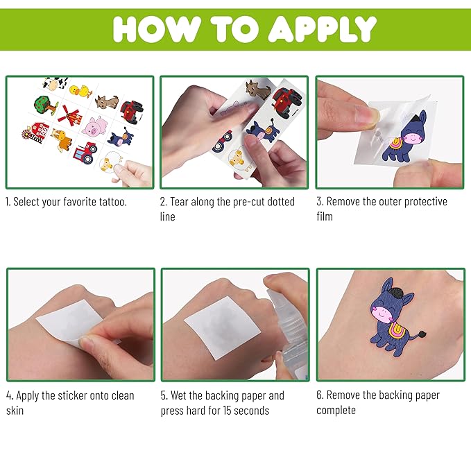 • πŸ„TATTOOS FOR FARM BARNYARD ANIMAL THEMED DECORATION: FARM DIE-CUT TATTOOS for people who love farm, farmhouse , Animal. Featuring 6 sheets with 72 pcs of lovely, fun and colorful design: Cow, pig, horse, tractor... Each sheet measures 6.3 * 4.7 inches. You can temporarily tattoo them on your body or objects such as phones, bottles, laptop…