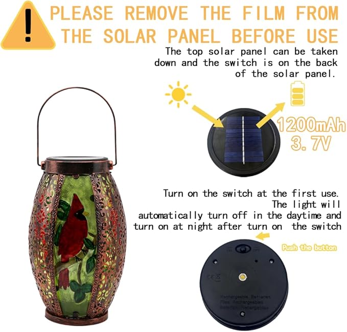 • Easy to Use: The film on the solar panel can be torn off; Before using for the first time, please remove the solar panel and press the switch behind the solar panel to turn it on; Solar table lantern automatically charges during the day and lights up at night