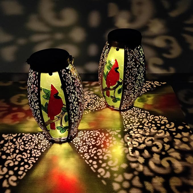 • Package Includes & Large Size: You get 2 retro solar lanterns and 2 shepherd's hooks; Outdoor solar lanterns are 6.3"W * 16.14"H; They not only have brightly colored hot-melt glass with cardinal patterns but also vintage metal with cutout patterns