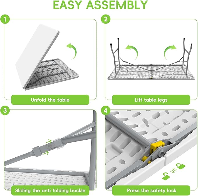 • Quality & Materials: This folding table 6 ft is made with high quality HDPE waterproof material, it has better durability and stability, the table legs are made of thickened steel pipes, can hold up to 300 pounds