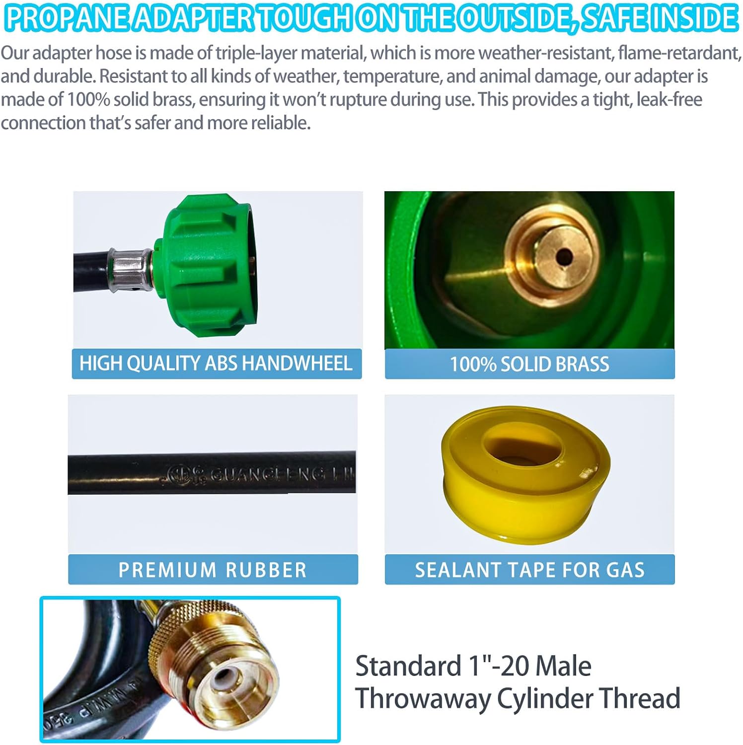 • Propane Adapter Tough On The Outside, Safe Inside: Our adapter hose is made of triple-layer material, which is more weather-resistant, flame-retardant, and durable. Resistant to all kinds of weather, temperature, and animal damage, our adapter is made of 100% solid brass, ensuring it won't rupture during use. This provides a tight, leak-free connection that's safer and more reliable. Our propane adapter hose is the perfect companion to the Weber camping grill.