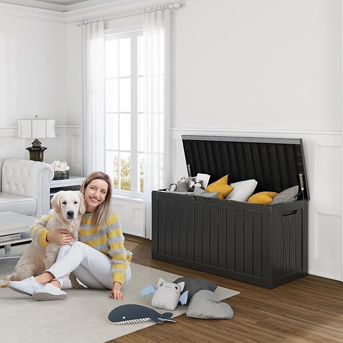 • VERSATILE IN EVERY SETTING: This patio storage box doubles as an indoor laundry organizer and an outdoor yard storage unit for cushions, garden tools, pool accessories, outdoor gear, and more, offering ample space. It can also serve as a side table, patio seat, storage bench, or footstool