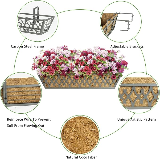 • Heavy Metal & Coconut Coir Fiber Liner: Crafted from robust carbon steel with a rust-resistant powder coating, this large black hanging planter box is strong and corrosion-proof, the natural coco fiber promotes healthy plant growth with good breathability and water retention, suitable for year-round planting, both indoors and outdoors