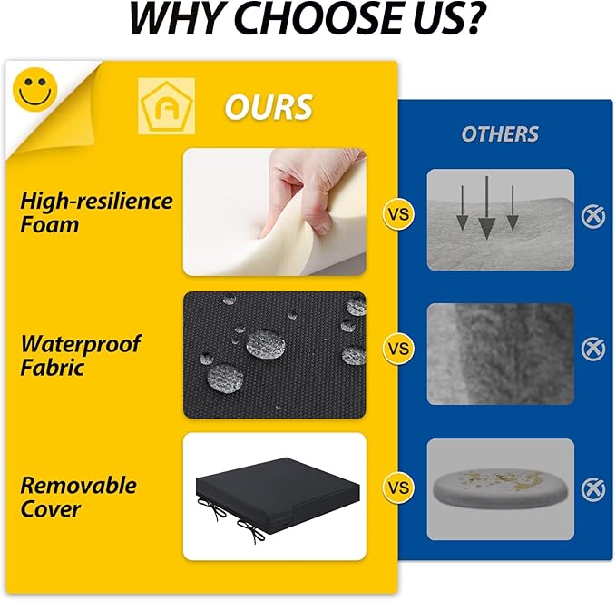• Wide Use & Tips: These outdoor dining chair cushions fit pools, patios, balconies, decks, backyards, and gazebos. Foam inserts and covers are packed separately in bags and placed in one box—check all parts. Easy assembly required