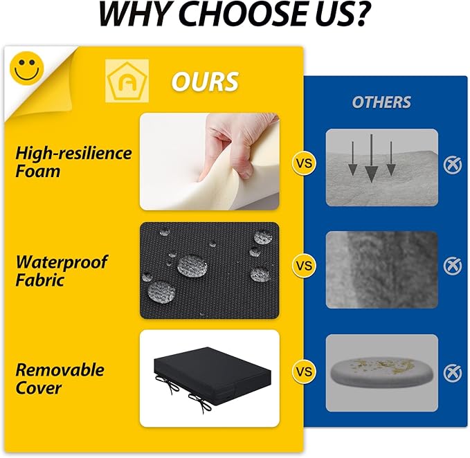 • Wide Use & Tips: These outdoor dining chair cushions fit pools, patios, balconies, decks, backyards, and gazebos. Foam inserts and covers are packed separately in bags and placed in one box—check all parts. Easy assembly required
