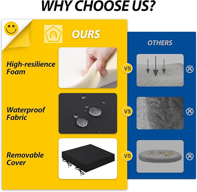 • Wide Use & Tips: These outdoor dining chair cushions fit pools, patios, balconies, decks, backyards, and gazebos. Foam inserts and covers are packed separately in bags and placed in one box—check all parts. Easy assembly required