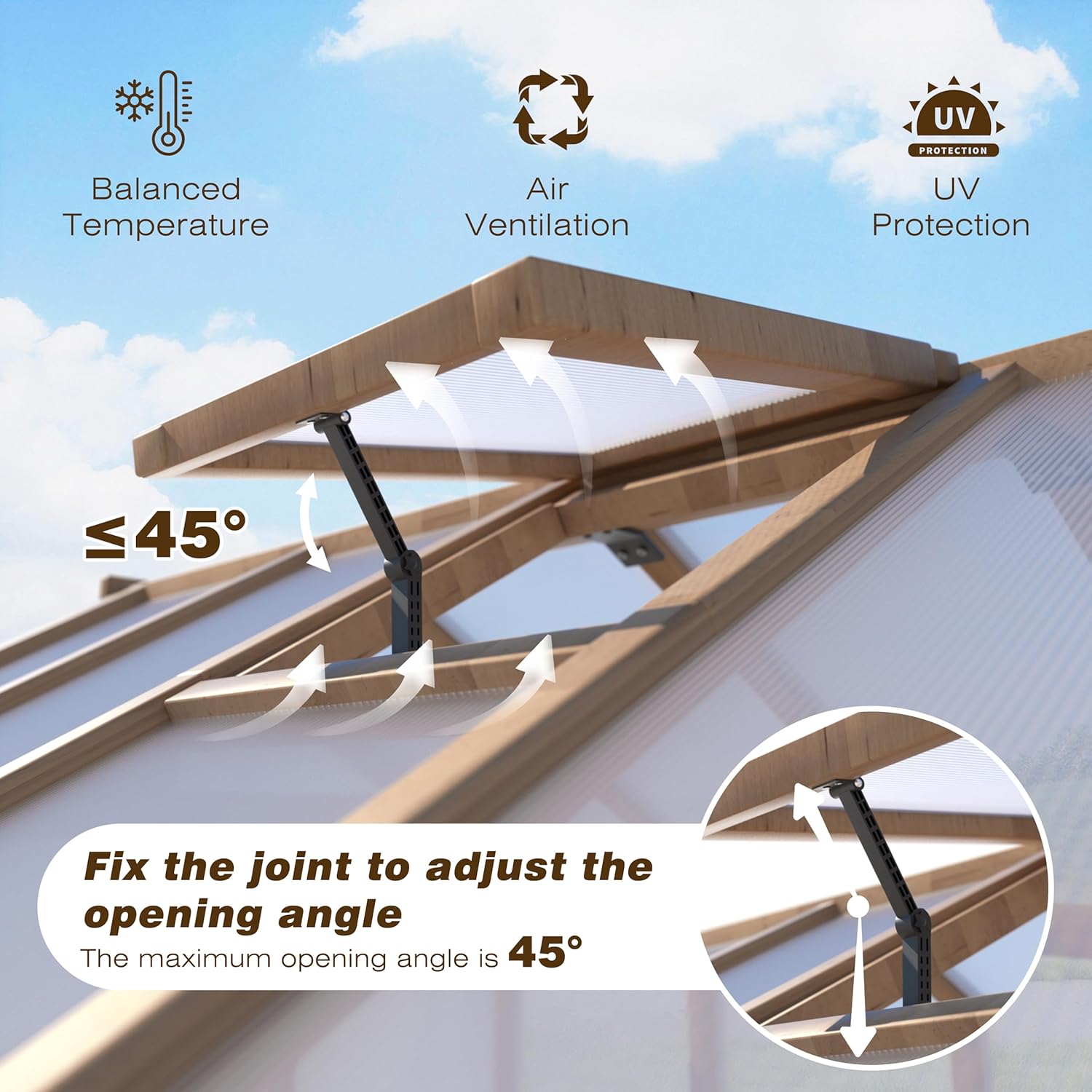 • Adjustable Roof: Our wooden outdoor greenhouse is designed with adjustable roof which is fixed with the joint to adjust the opening angle. You can adjust the angle to meet you need, and the maximum opening angle is 45 degree. Adjustable roof design provides UV protection while ensuring temperature balance and air circulation