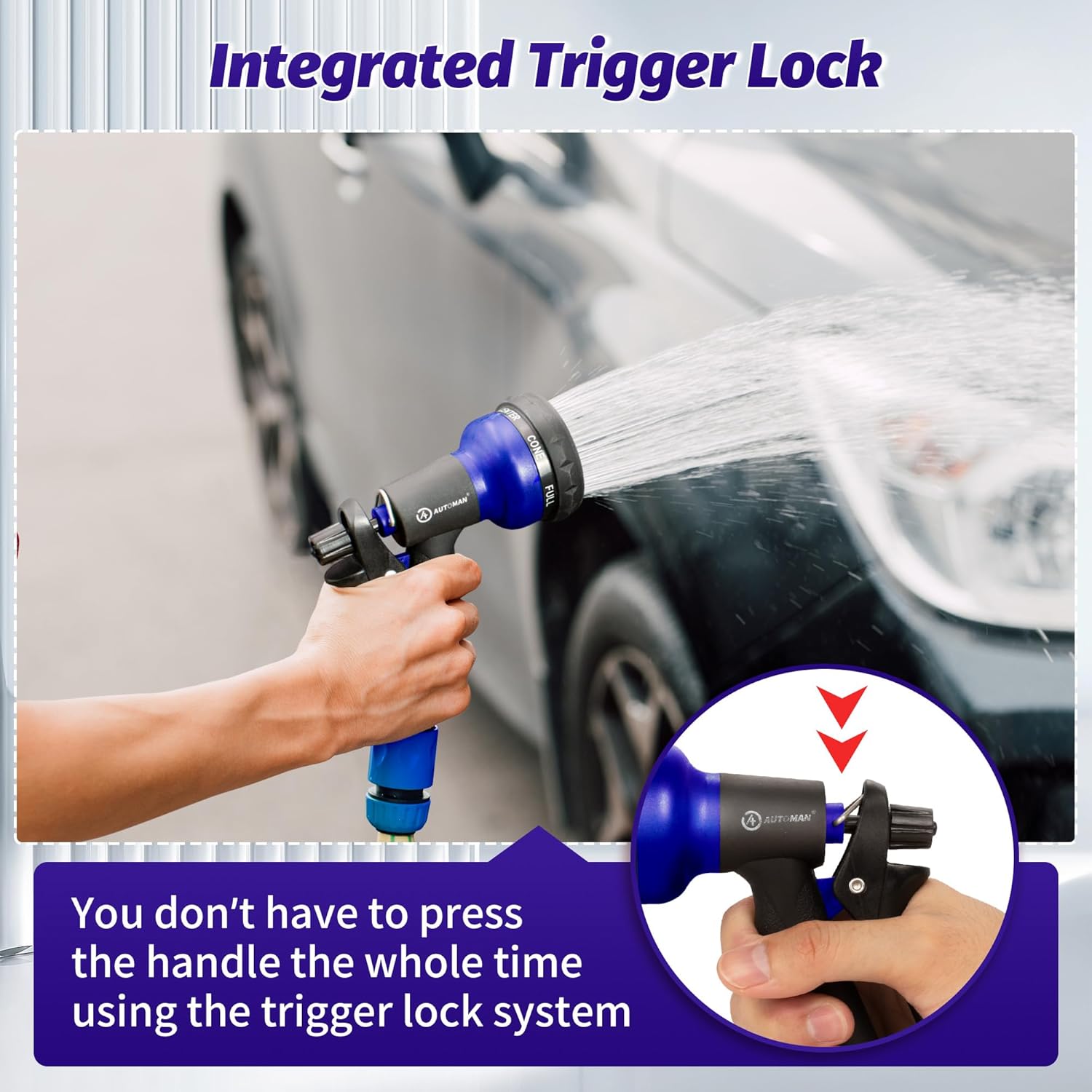 • Labor-Saving Design: AUTOMAN garden nozzle features a nice lock bar at the top of the handle that keeps the water remains on without you having to apply any pressure.Just use the lock so you don't have to keep your hand holding it the whole time.