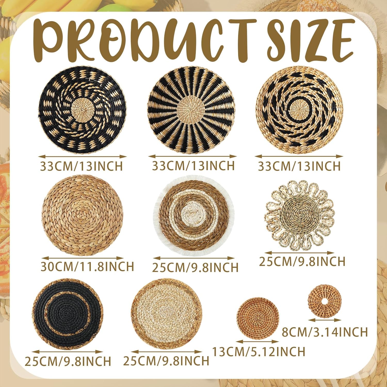 11 Pcs Boho Hanging Wall Basket Decor Handmade Woven Basket Wall Decorative Boho Wicker Baskets Placemats Round Farmhouse Bulrush Art for Rustic Home Decorations Christmas Gift(Assorted)