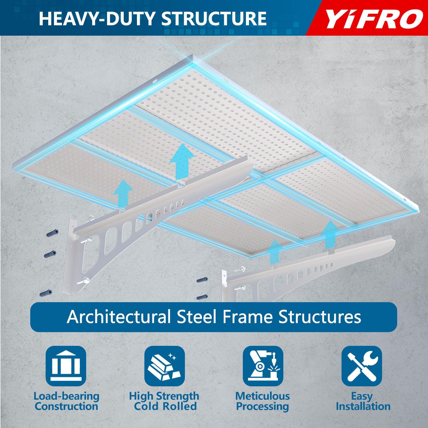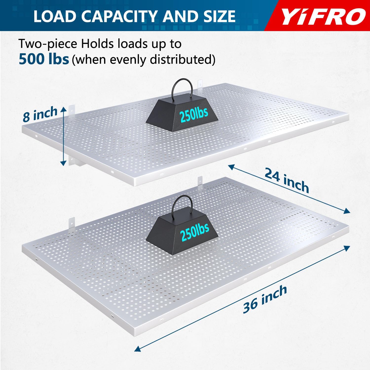 • HEAVY DUTY CONSTRUCTION: YIFRO garage wall shelving takes its cues from architectural frame construction, with a 2x3 ft individual bracket load capacity of 250 lbs. and a total of 500 lbs. for 2 shelves, which makes it easy to store most of the items in your garage.